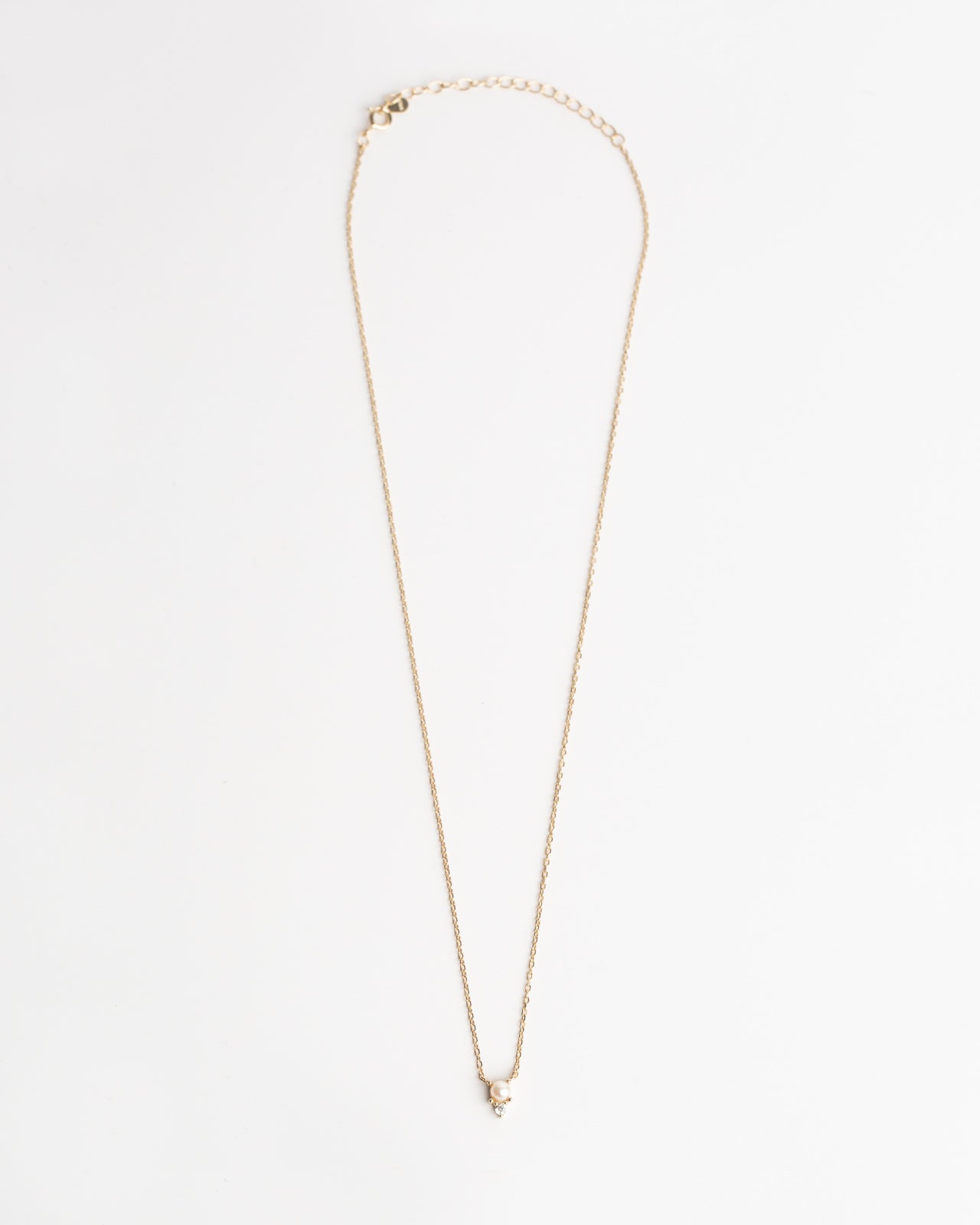 Featuring a petite pearl delicately suspended alongside a tiny sparkling stone pendant.