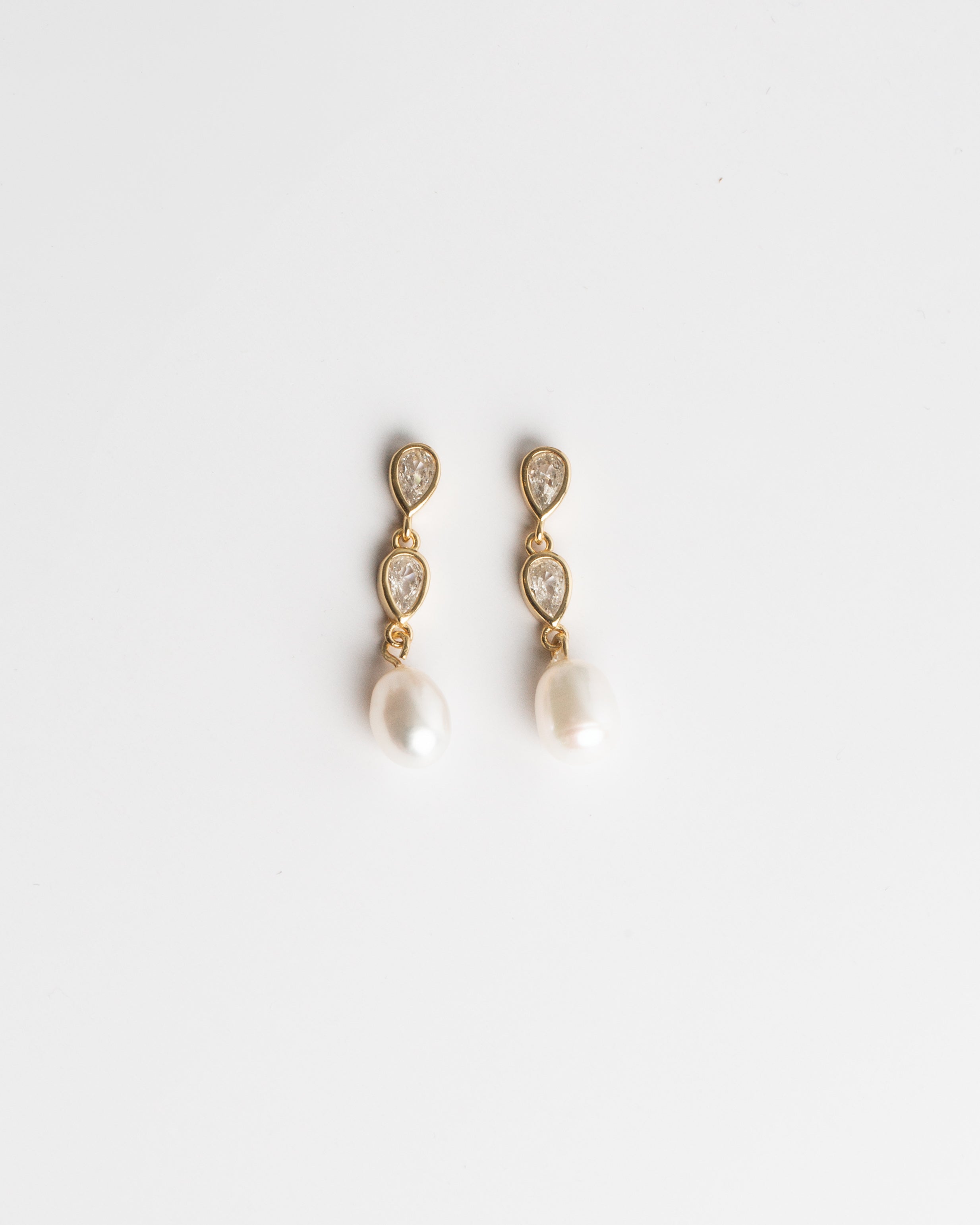 Two teardrops of sparkling stones lead to a single luminous pearl, like raindrops finding the sea. A modern heirloom that carries quiet grace and a touch of gold-warmed light.