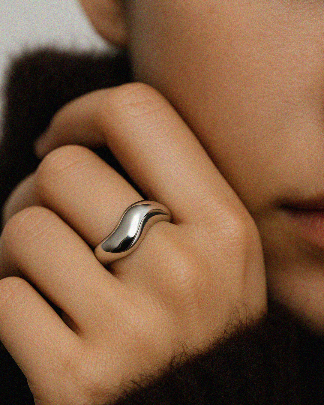 A sculptural form inspired by movement. The Silver Wave Ring flows with soft curves that catch the light from every angle. Minimal yet striking, it feels like liquid metal on your hand. A quiet statement that moves with you.